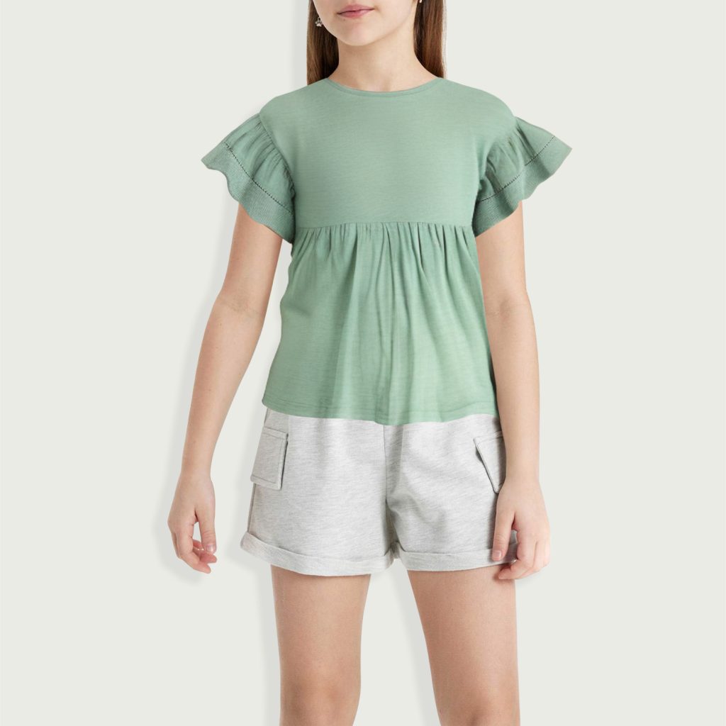[Product Details] This short-sleeved babydoll T-shirt for girls is made of bamboo knitted fabric blended with 60% cotton and 40% polyester. The fabric is soft and breathable, with excellent touch, giving children an all-day comfortable experience. The sleeves are embellished with exquisite eyelet embroidery details, adding a playful and elegant temperament. The classic round neck […]
