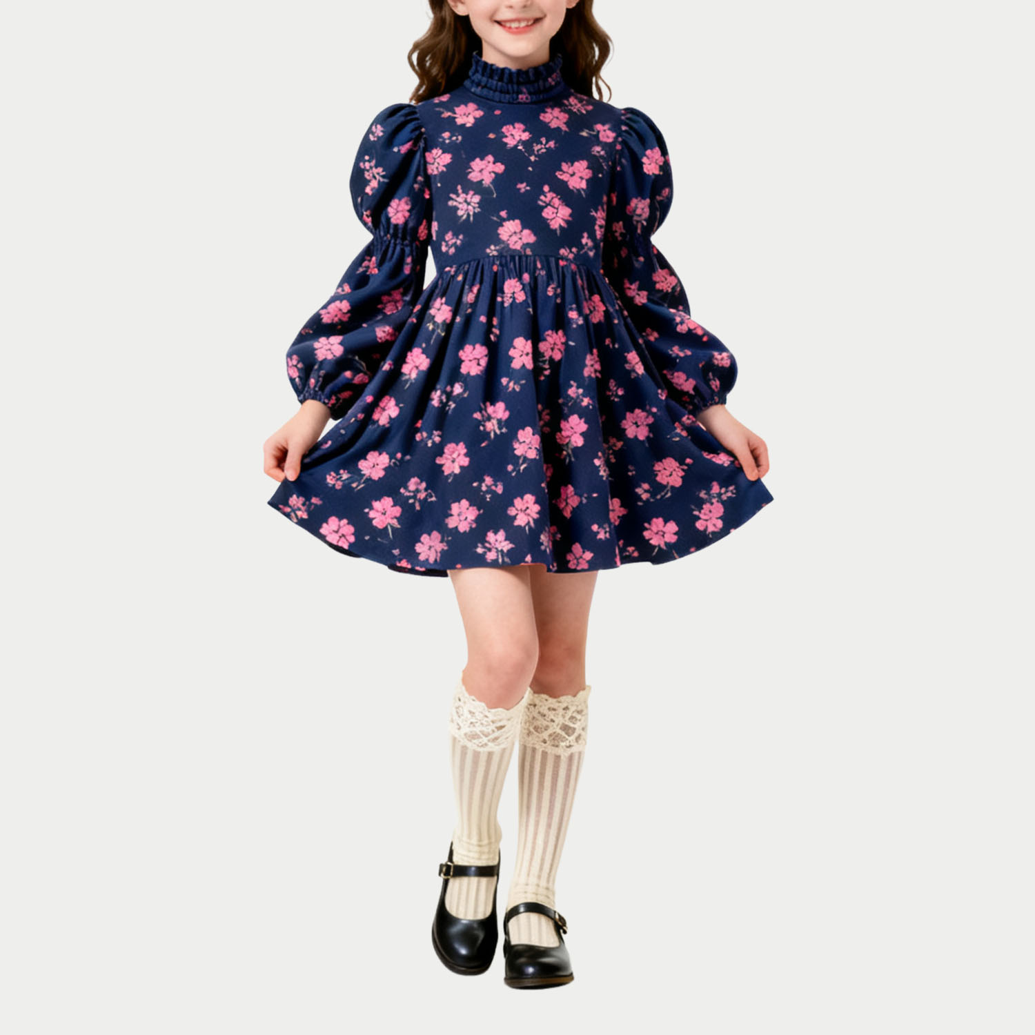 Retro Floral High-Neck Puff Sleeve Girls’ Long-Sleeved Dress
